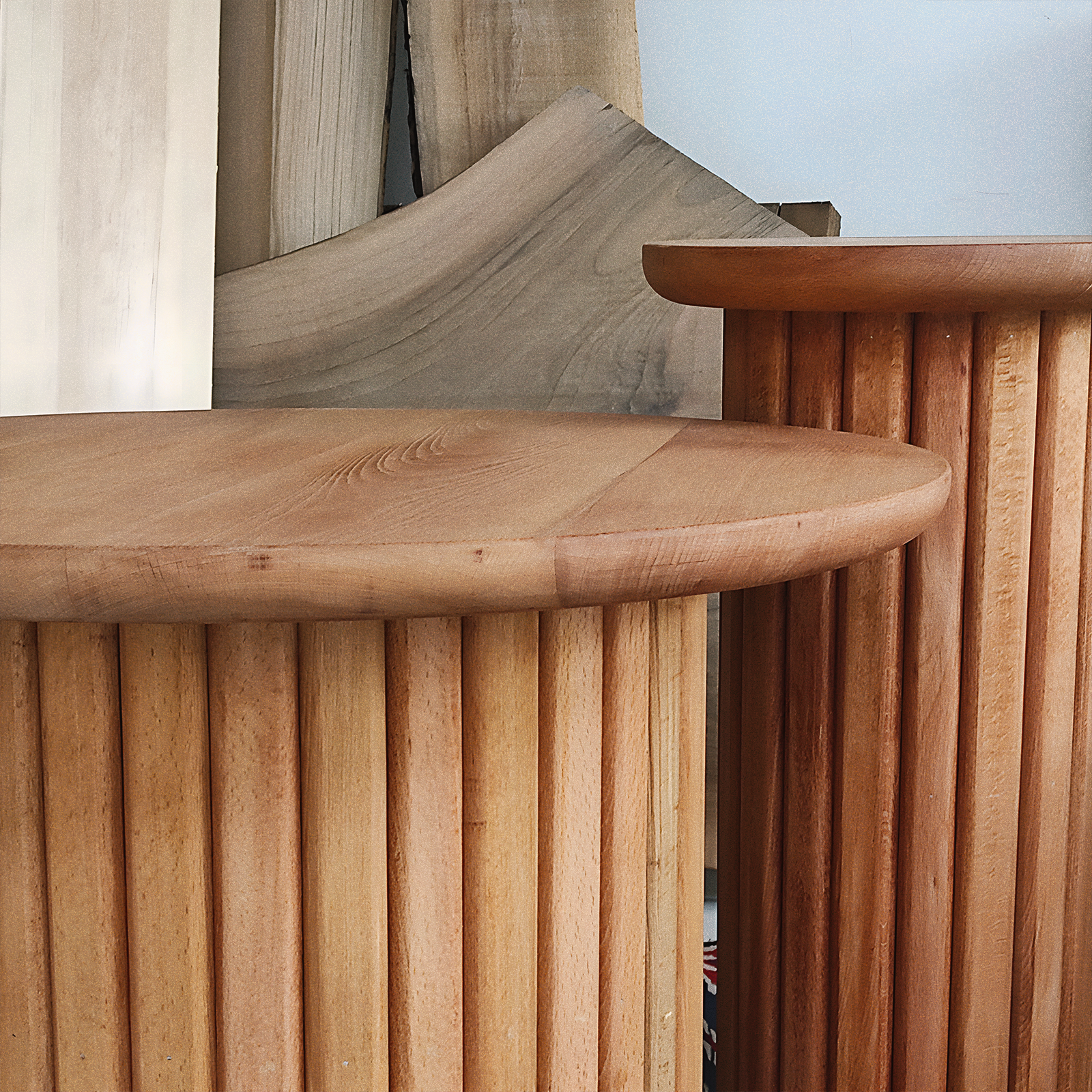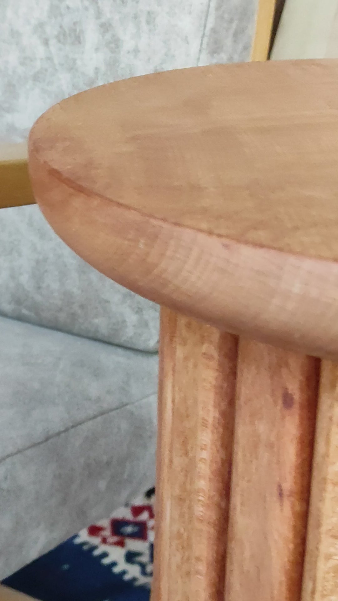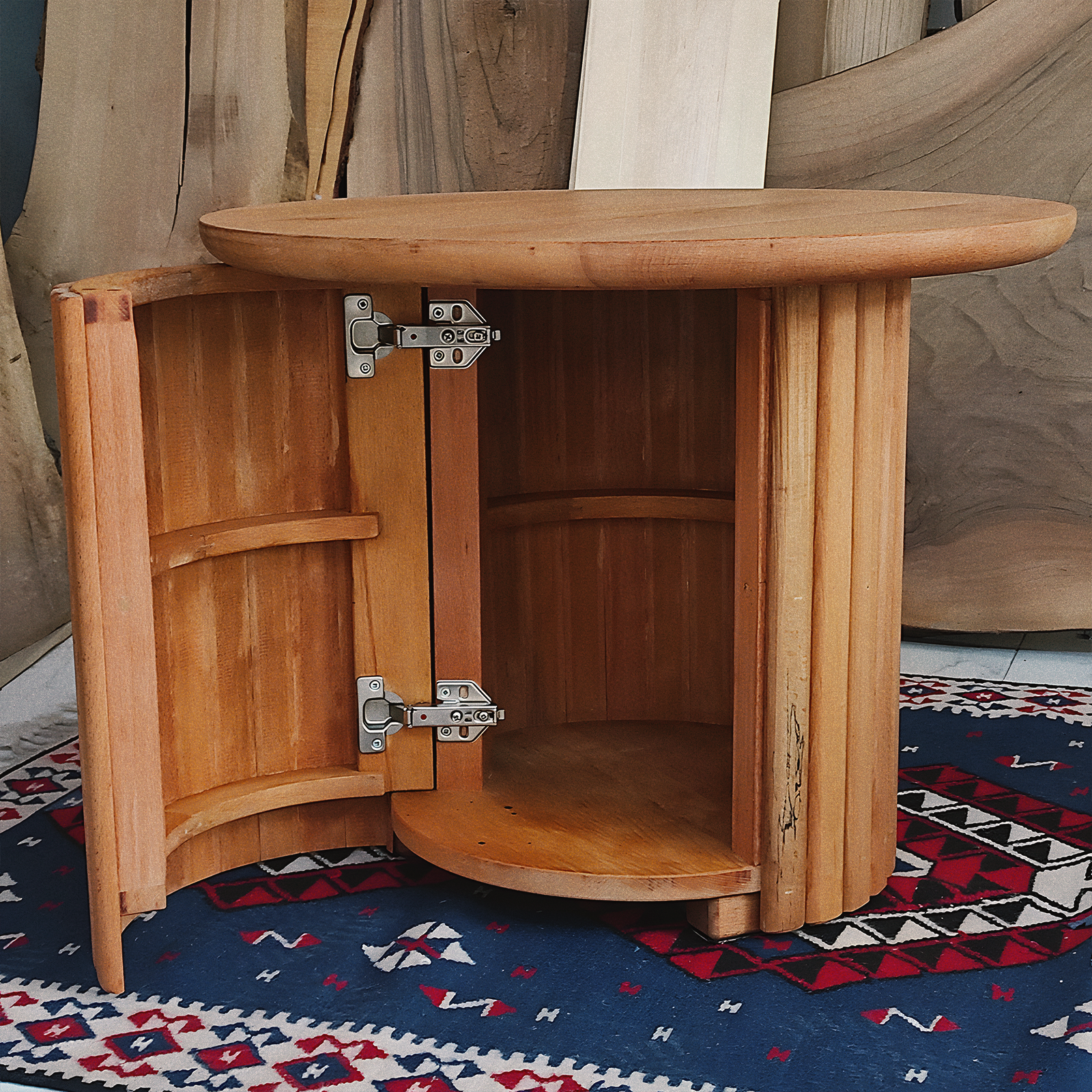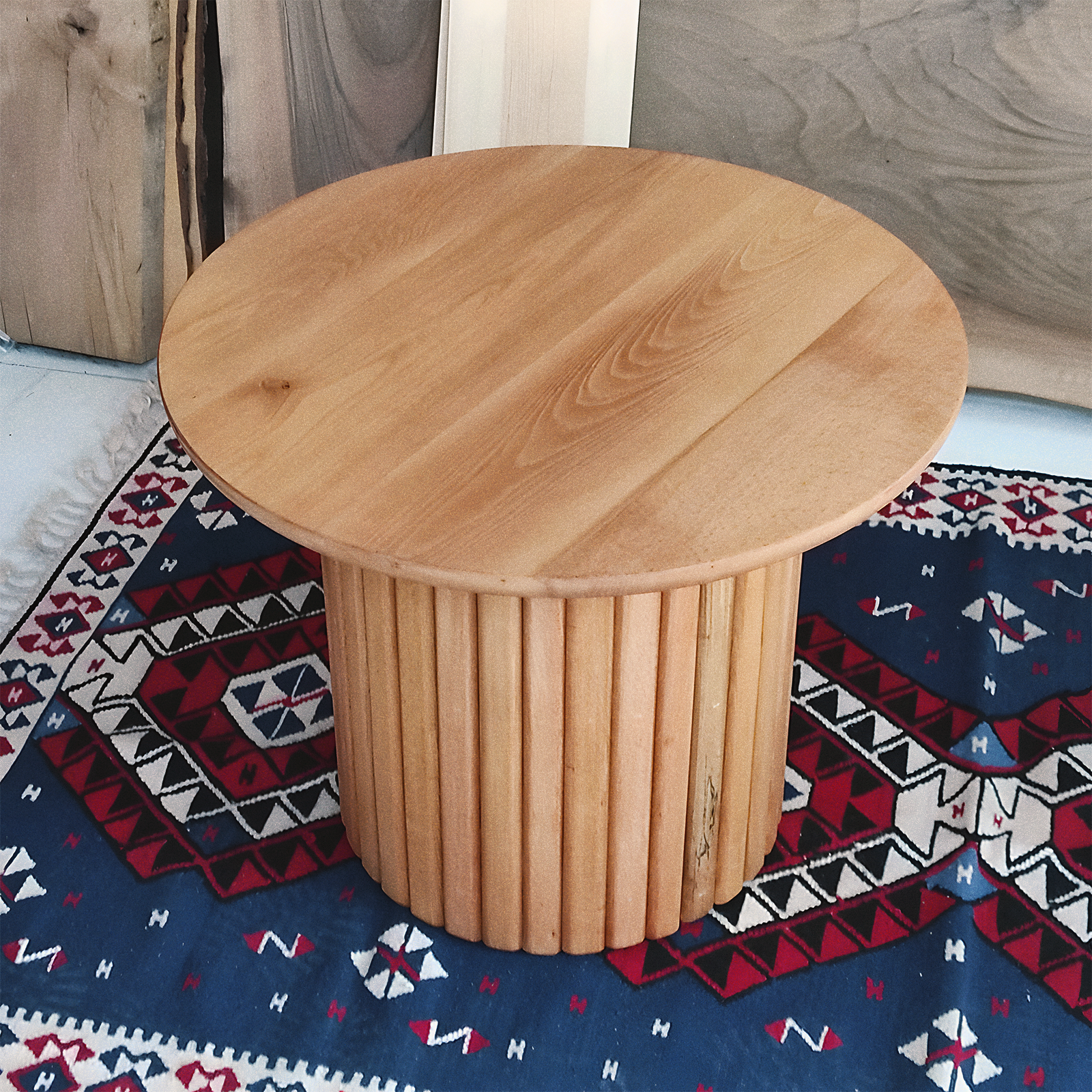 Sehpaların silindir ayak tasarımında, estetik ve işlevselliği bir araya getiren balık sırtı desenli detaylar kullanılmıştır. Orta sehpanın içinde yer alan gizli dolap bölmesi, eşyalarınızı düzenli bir şekilde saklama imkânı sunar. Üst yüzey, 4-5 cm kalınlığında masif 3 adet kayın ahşap panellenerek üretilmiş ve kenarları yuvarlatılarak hem zarif hem de çocuklar için güvenli bir görünüm kazandırılmıştır.